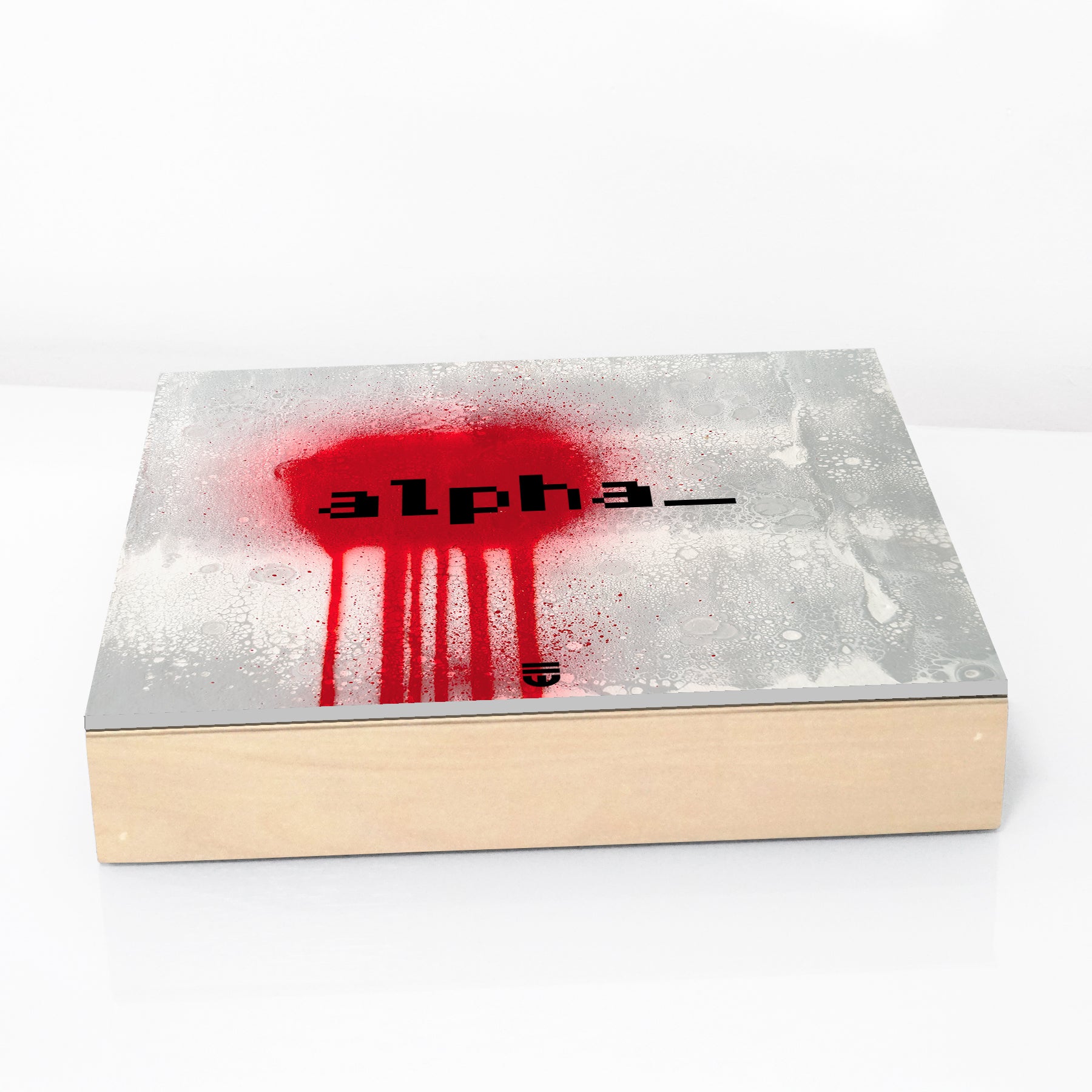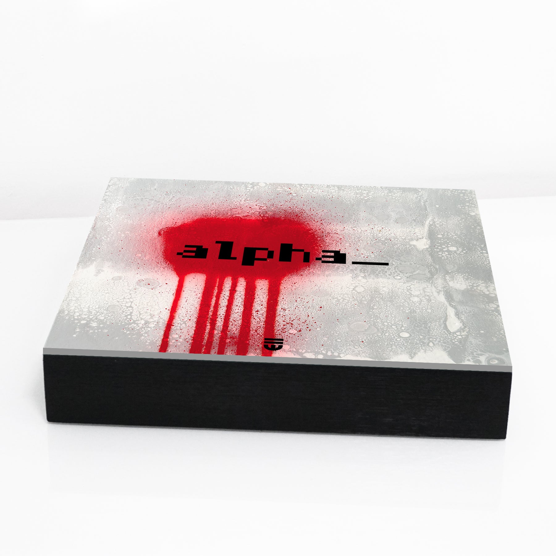 Acrylic, automotive paint, polymer, reactants, flow conditioners and varnish on hardboard, mounted on a wood panel. Executed with airbrush and silkscreen techniques, applied with precision and intention.