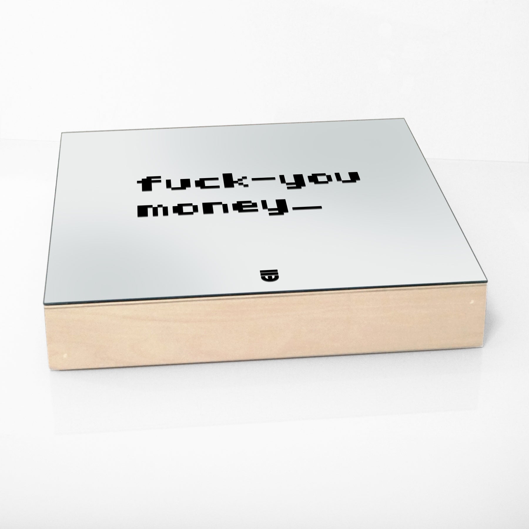 Acrylic and polymer on mirror, mounted on wood panel. Silkscreened using our overprinting technique: multiple layers of paint meticulously applied to create a subtle, tactile depth within the text.