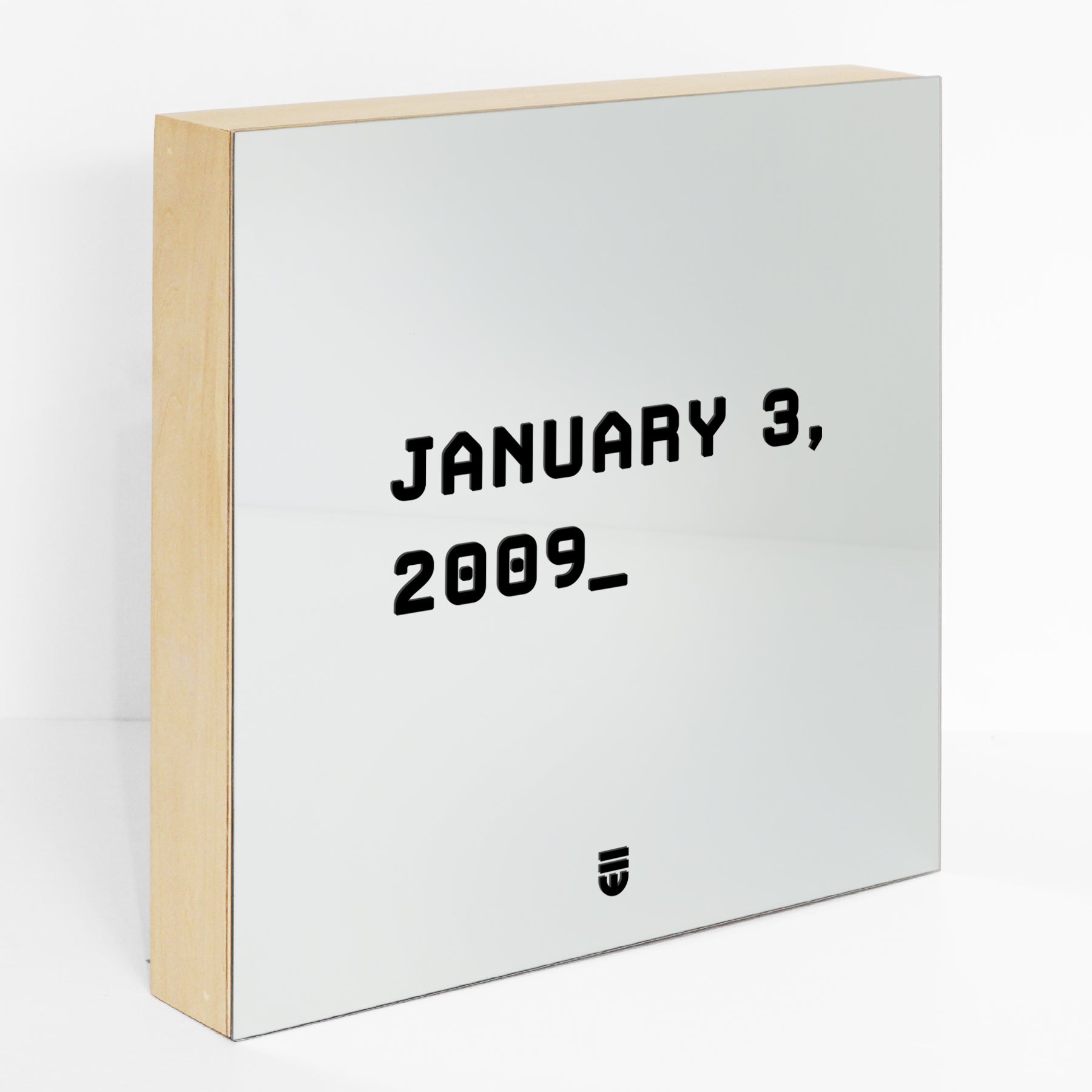 Acrylic and polymer on mirror, mounted on wood panel. Silkscreened using our overprinting technique: multiple layers of paint meticulously applied to create a subtle, tactile depth within the text.